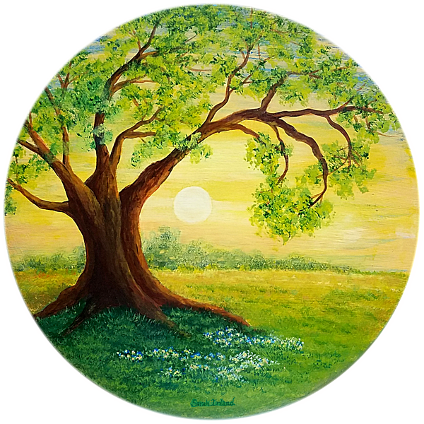 This painting is on the top of a small round hand painted landscape table. The "Until Tomorrow" table is a 3 legged end table that is16 inches in diameter and 24 inches tall. While the table itself has been sold, prints of this painting transposed on a square background are still available.